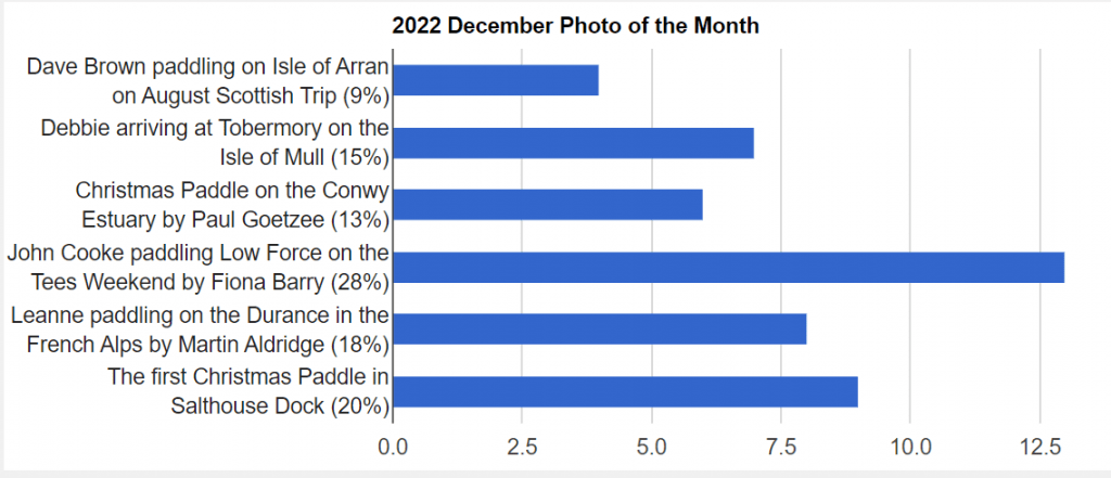 First Place – John Cooke paddling Low Force on the Tees Weekend by Fiona BarrySecond Place – Christmas Paddle in Salthouse DockThird Place – Leanne paddling on the Durance in the French Alps by Martin Aldridge4th Place – Debbie arriving at Tobermory on the Isle of Mull5th Place – Christmas Paddle on the Conwy Estuary by Paul Goetzee6th Place – Dave Brown paddling on Isle of Arran