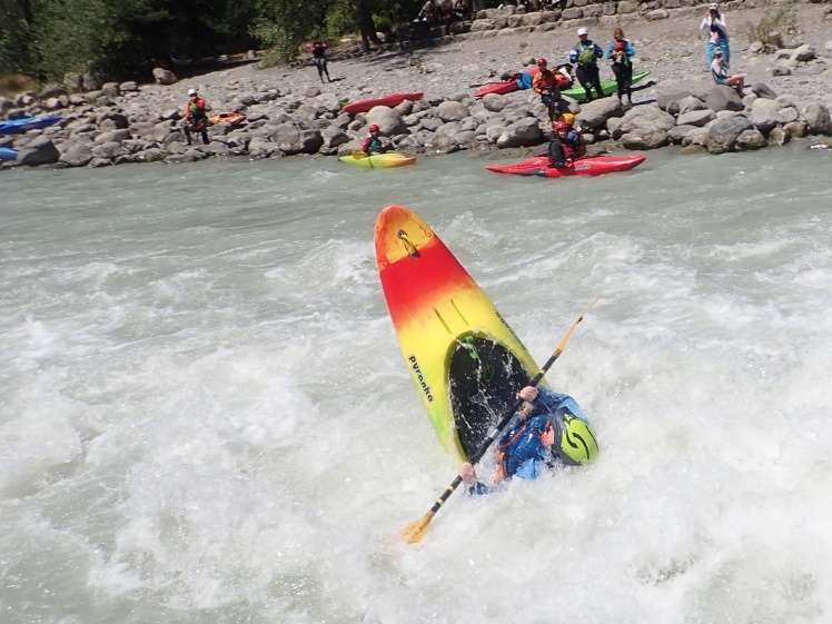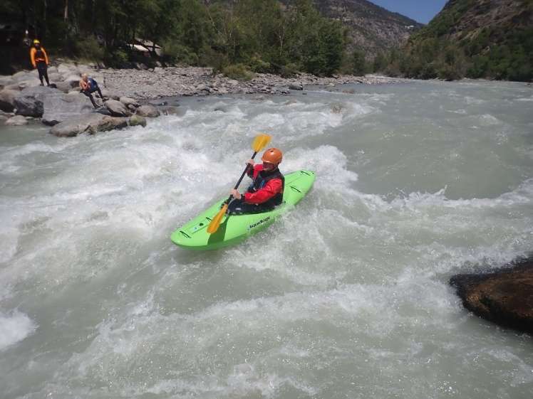 Another glorious day of paddling big and bouncy Alpine rivers. Today we returned to the Durance to run the section from St Clement to Embrun, a distance of around 18km. We all convened at the extremely convenient get-in at St Clement, with its associated bar, loos and slalom course (the French really have got kayaking sussed). Those people that were educated to PhD level, and therefore understood the shuttle logistics, did the shuttle. The rest of us relaxed in the shade (it was hot) and had an early lunch. Once on the water we progressed through a succession of entertaining wave trains, welcoming the opportunity to get a dousing to cool down. In the few intervening flat bits it was great to idly float down the river and take in the amazing scenery – pointy peaks everywhere!