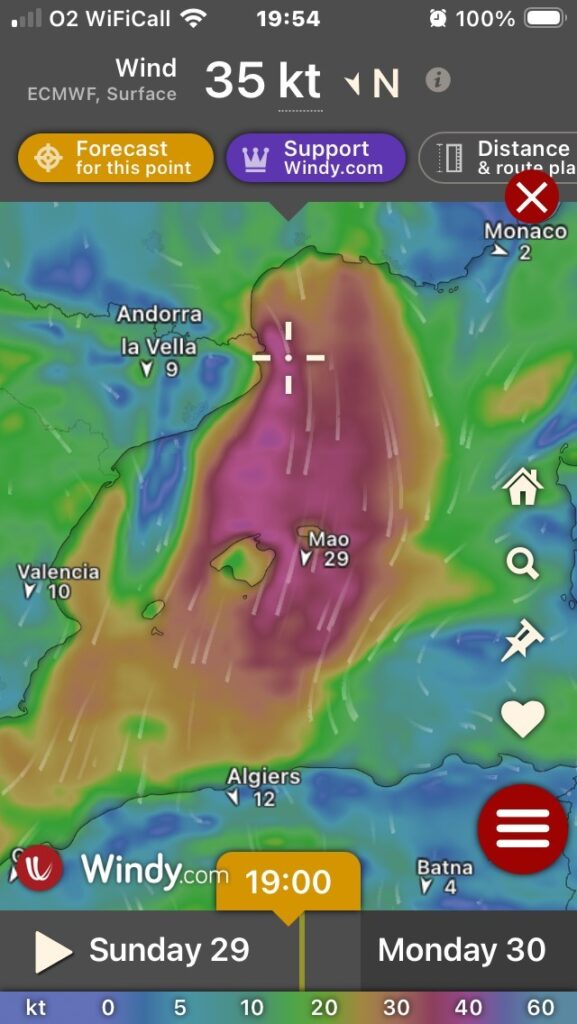 We had allowed nine to ten days for the journey, but opted to finish three days early as forecasts showed the return of strong winds. Rather than sit it out exposed near Es Grau, we moved inland and took accommodation near Mahón—a decision fully justified when force 7+ winds set in for the final three days.