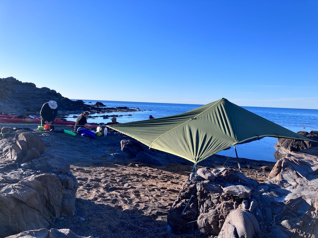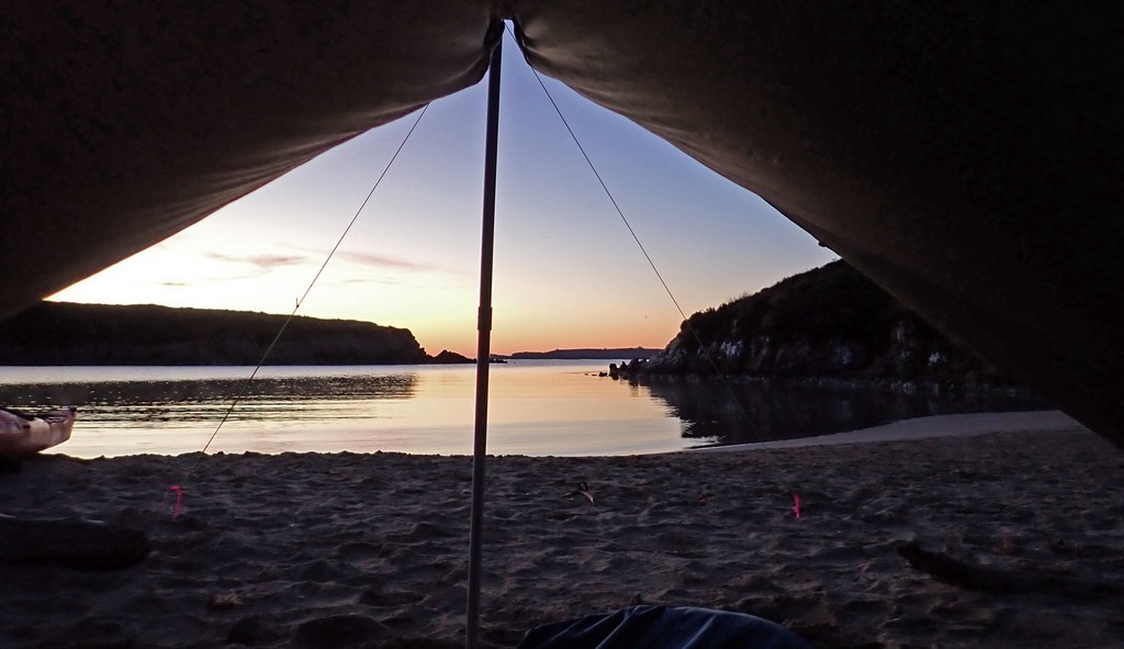 Having spent our first night of the adventure on Cala Pudent beach under the stars, we awoke to a beautiful morning, the perfect start to our day 2 adventure and exactly what we were hoping for. If you look at the photo of the beach, you’ll notice a tarp and groundsheet arrangement. This tarp belongs to Chris, who was brave enough to spend the night with only a bivi bag and tarp for cover, unlike the rest of us softies in our tents. It had been a cold night, but the weather was forecast for light winds and wall-to-wall sunshine, so perfect conditions, as we also had a small tailwind.