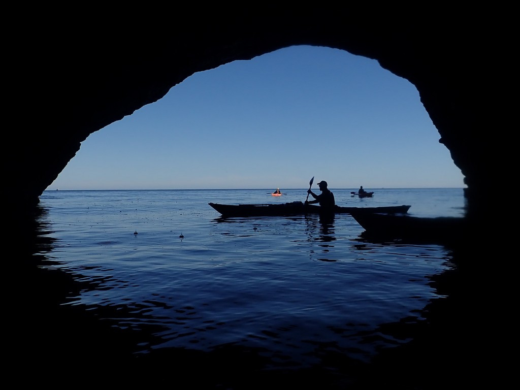Everyone had successfully repacked their kayaks, cleared up after ourselves, and we set off in good spirits just after 9 am. The coastline on this part of the island, like most of Menorca, consists of rocky cliff faces, occasionally interspersed with small sandy beaches, and it became a game of spot the animal or famous face in the rock formations, with one notable rockface, apparently, resembling a giant bear! We took the opportunity to dive into as many caves as possible, which was a good opportunity to cool off in the chilled air of the caves.