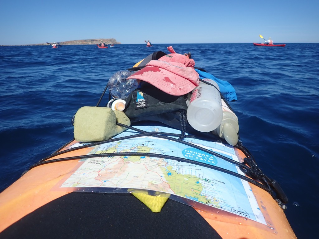 It’s always a big responsibility, on these trips, to find a suitable place to stop for elevenses,” and we were fortunate enough to have the small town of Fornell’s on our route for today. On our arrival, we scouted for a suitable landing spot but were at first refused landing, as kayaks are not welcome in the marina, so instead, we found a very small rocky beach on which to land, our 6 kayaks taking up half the space available. Fornell’s turned out to be by far the biggest town along the north coast, and it was the only occasion on the trip where there was an opportunity to top up on supplies. There was a small shop on a back street behind the main sea front, and I was glad to purchase a large ham and cheese baguette, which sufficed for lunch and much of the evening meal. With hindsight, I would have bought at least another and saved it for the next day, take note anyone considering a tour of Menorca, food stops are almost non-existent on the coast.