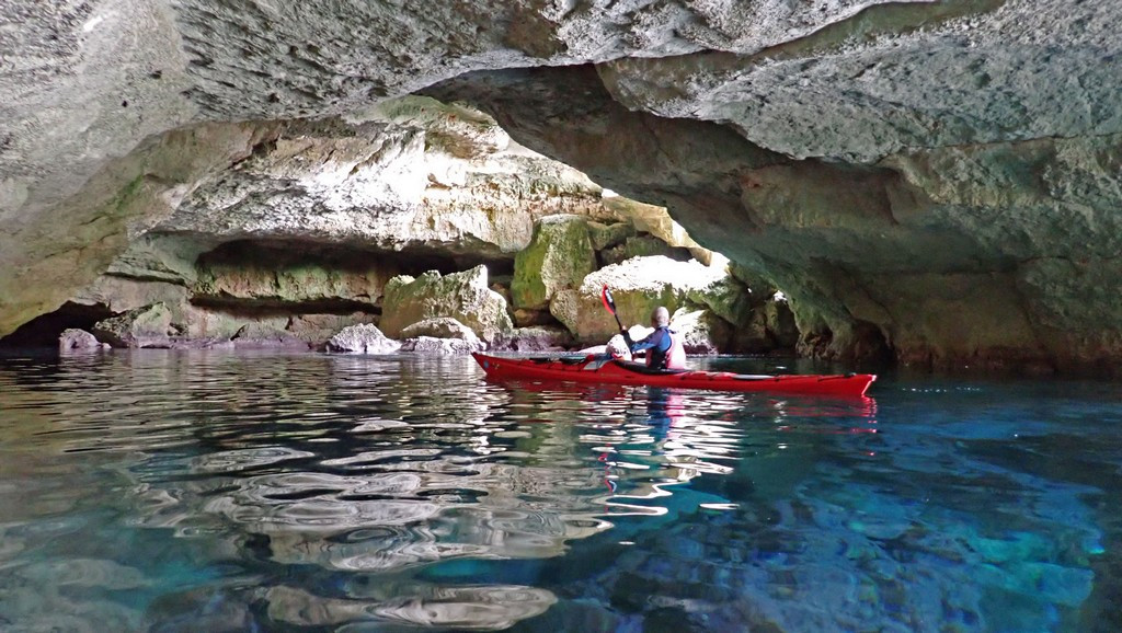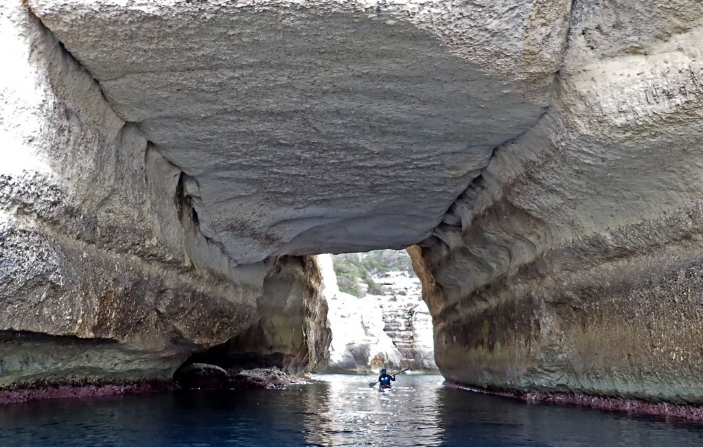 We entered some quite deep caves, but had to move on in case Friday turned out to be the last day we could paddle. As they face SE, we were usually past them before they were obvious. This was perhaps fortunate. We saw one very tall cave with a stalactite in the roof like the sword of Damocles. Although the rock in this part of the coast looked like the sandstone further west, the sand grains are calcareous, like limestone, so they can form stalactites.