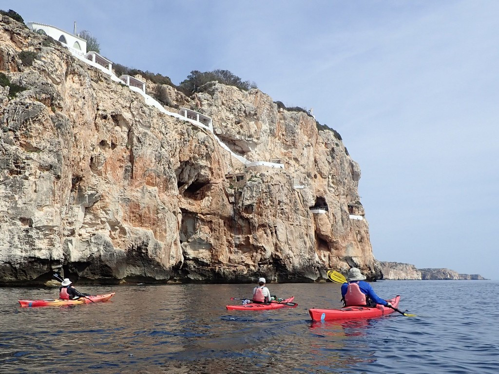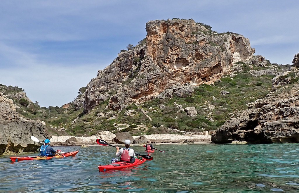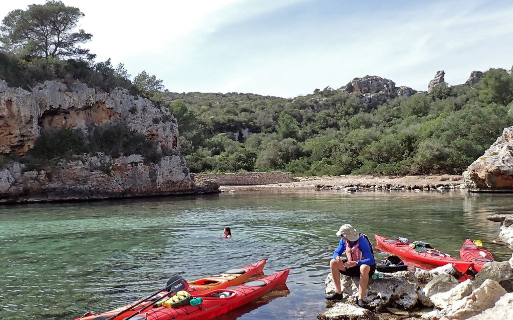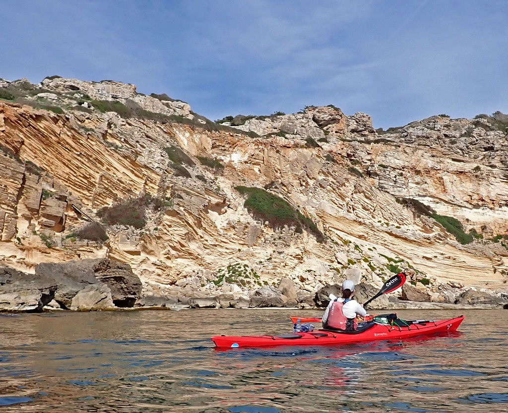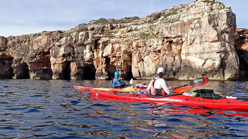 The previous day, we’d knocked 41km off the remaining distance but still had about 70km to paddle to complete the circumnavigation, and two consecutive 40km days might be too much. Today and tomorrow should be good paddling days, but the weather for the day after was as yet unclear. The further we went today, however, the lower the risk that we’d run out of time and have to ask for a pick up from Menorca en Kayak. That in turn might restrict our choice of overnight stop tomorrow, as a pick up would have to be from a beach with road access. There was also uncertainty about whether the wind would drop for Tuesday, so that if we stayed with the boats on a sheltered beach somewhere, we could paddle then. The alternative would be to return the boats on Saturday and find somewhere to stay. So the plan for today was to avoid too many stops and too many caves, but have a good break for lunch on a sunny beach where wet overnight gear could be dried.