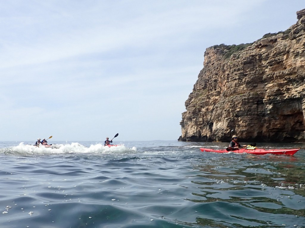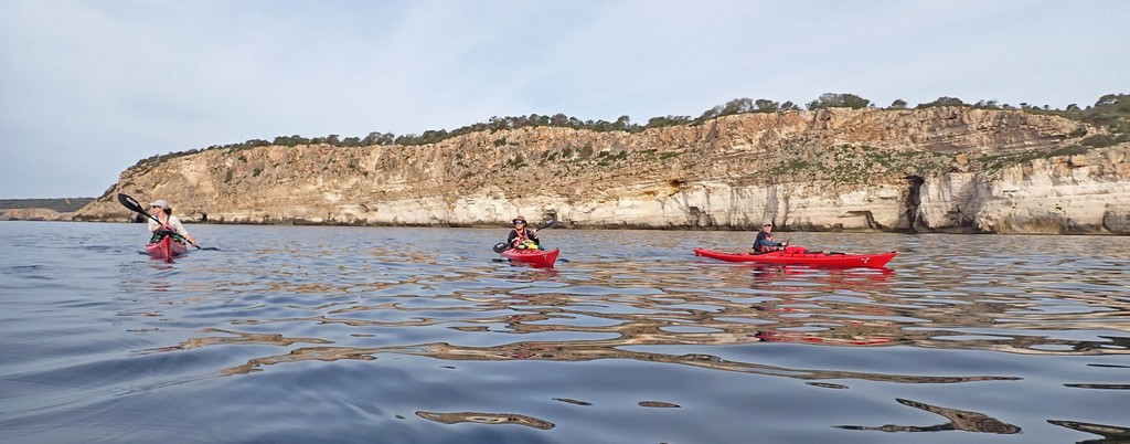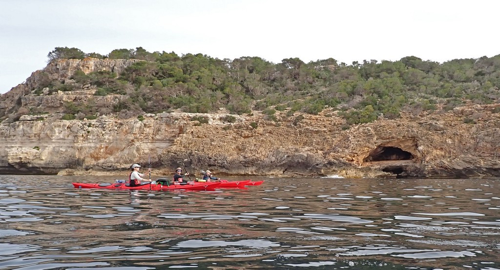 We had now reached the section of coast famous for its caves, but had to restrain ourselves. We had been warned by Menorca en Kayak that the first cave after Calescoves was sometimes closed to avoid disturbing bats, but the notice requiring this wasn’t currently in place, so we could enter if we were quiet. We were unsure which was the first cave, as most face SE due to the direction of rock weakness, so they are easy to miss when travelling East. The first cave we went in had a dark area at the back, and there was a quiet twittering noise. Keith assured us there could be no bats as there was no smell of guano. There had been shags flying around the cave entrance, and the noise may have been chicks on a nest.