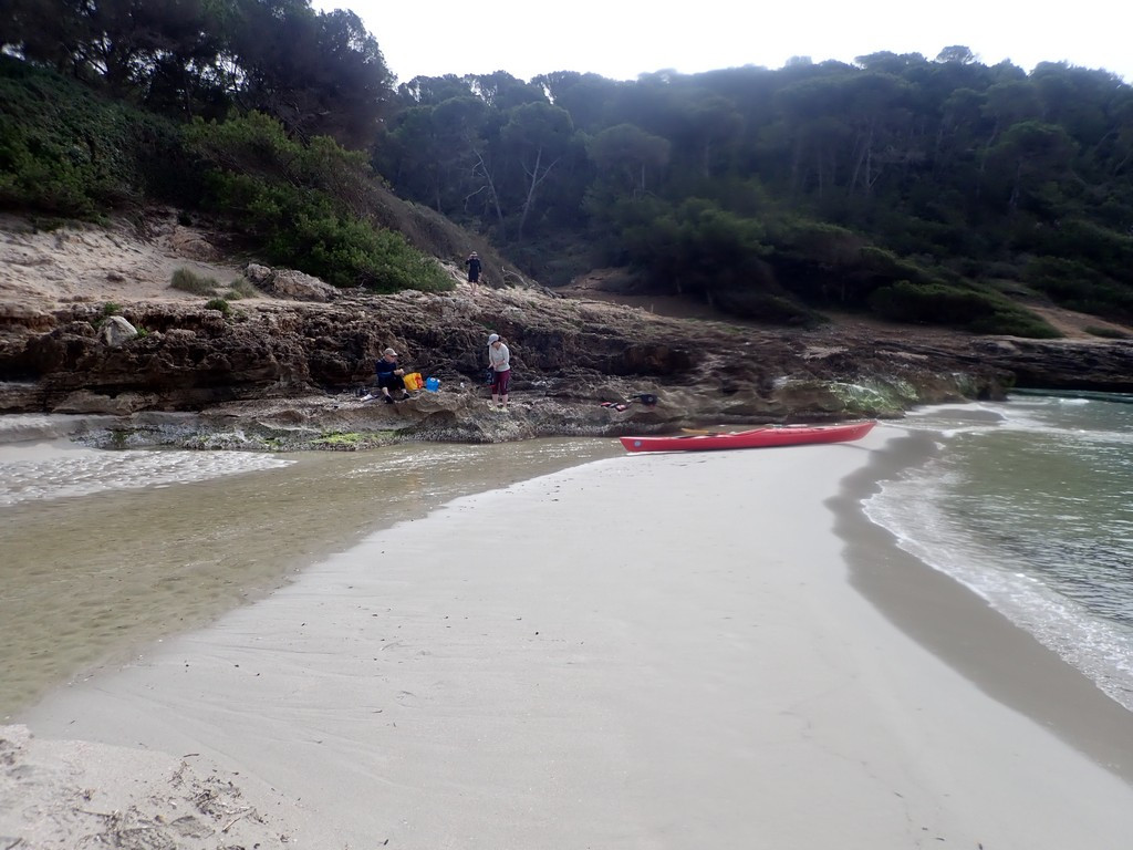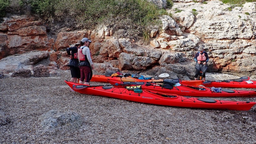 We reached Cala Biniparratx at 6:14 pm, hoping that we could camp, as we’d had a long day, even though it wasn’t 40km. The beach was initially uninviting due to weeds, but once landed, it was reasonable, although in total shade, as it was in a deep gorge. We decided it was good, and hoped it would get the morning sun, although Keith did say we couldn’t possibly stay there as it was too noisy, being almost directly under the runway approach for Mao airport. An odd effect was that the noise of aircraft powering up for take off was reflected from the cliff on the South side of the gorge, and it sounded as if the aircraft was over the sea.