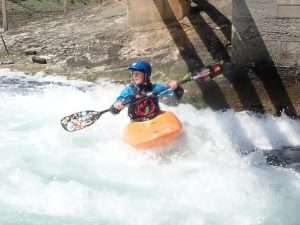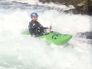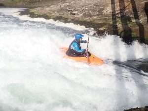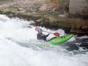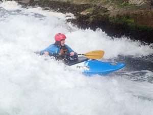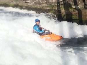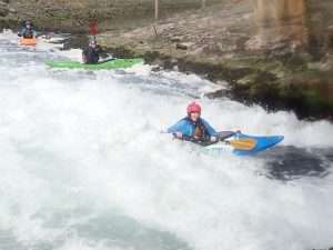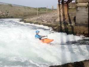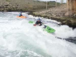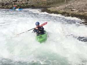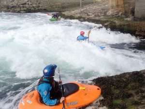 After some reassuring words from Sara, we all took turns to ride the wave. It was fab. Really clean and easy to get on. Sara was able to make some spins and bounces. The fun bit was the wave. The scary bit was the big boily mess behind you which made for great rolling practice. The water is still dripping out of my nose when I lean forward.