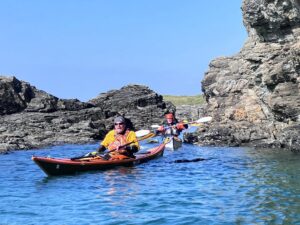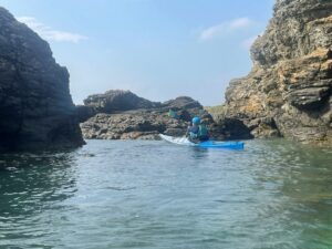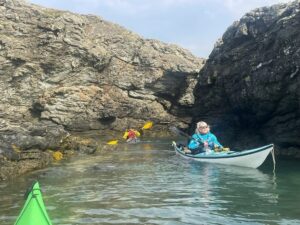 Saturday was a sunny and windy day. We had to change our plans in the morning to avoid strong winds. Instead of paddling from Rhosneigr to Aberffraw, we set off from Porth Dafarch towards Treaddur Bay. We were hugging the coastline and had a mostly sheltered paddle towards Treaddur, exploring caves and hopping rocks, enjoying the sunshine and only occasionally having to paddle out in the wind. We had lunch in Porth Diana on a sunny, sheltered beach. The sheltered location gave us protection from the treacherous wind, which we realised once we paddled out of the bay and into the very strong headwind.