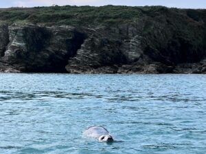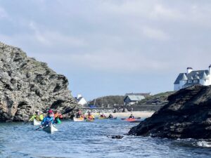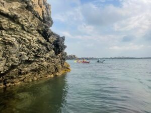 The way back to Porth Dafarch was mostly easy and we decided to paddle a bit further into the next bay. There we had fun company. An adult seal was swimming with us for a while, following one of the paddlers. The adult was then joined by two pups who seemed to think we were just the right audience for them to show off their skills to. They put on a fun show of swishing and swirling through the water, sticking around for quite a while. They were so lively and vivacious that none of us managed to capture them on a photo as more than a swish.