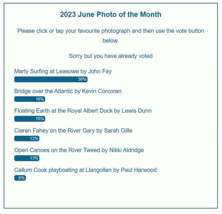 Results of the 2023 June Photo of the Month Competition – Congratulations to John Fay for his winning June photograph of Marty Sinnott at Leasowe Bay. Please send any photo for next month`s competition to website@liverpoolcanoeclub.co.uk