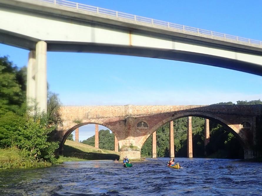 After a good night’s sleep, we were up and sorting breakfast and packing tents away early. We were on the water for 8:30am but the river had dropped a little from the previous day but was still at a very good summer level. We very quickly came across the triple bridges (An old railway Viaduct / Old road bridge / new A68 road bridge).