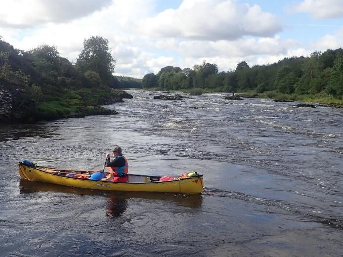 After a further 5km we were expecting another weir (Rutherford Cauld). There was a small rapid ahead and it did not look like a weir, so we drifted up to the edge and then one after another paddled over. The waves were considerably bigger than expected but we had little time to prepare and get settled in our canoes. Looking back, I saw Brian out of his boat, but it had remained upright – he was holding on to a cow’s tail at the back and was waving and smiling so all was good. Ian managed to get to him as he drifted downstream still in the wave train and Brian managed to climb over Ian`s canoe and into his. We all eddied out behind a fisherman`s wing dam or wing dyke (artificial wall into the river) to bail out.