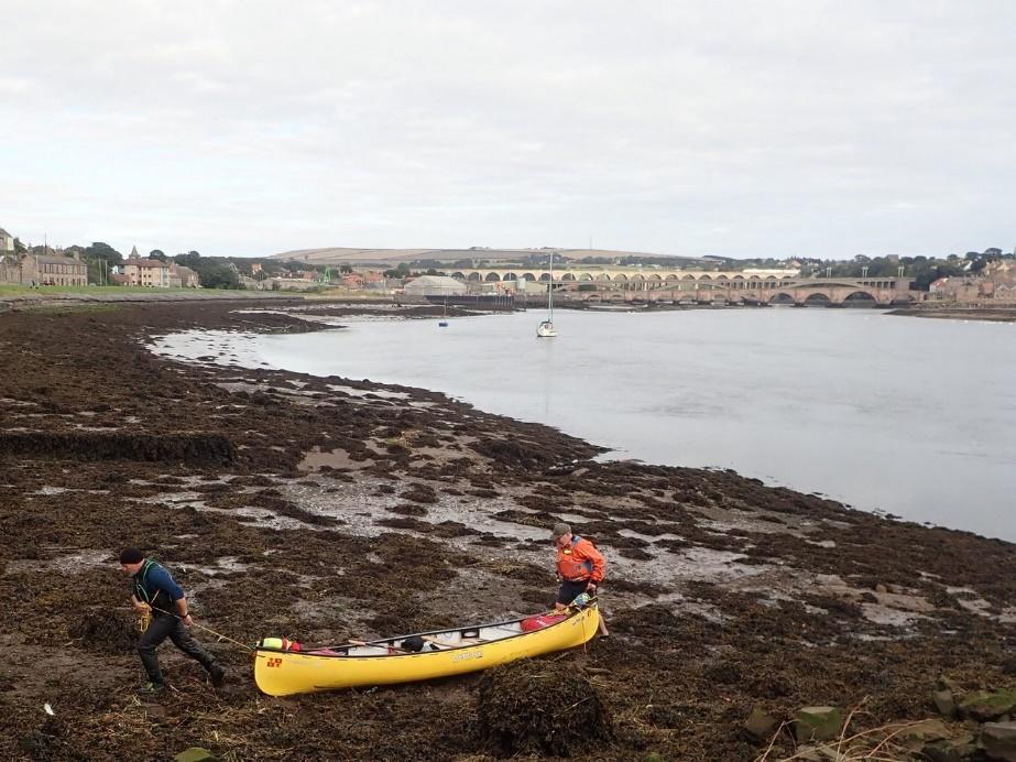 The plan was to get up early and paddle into Berwick for a late breakfast. We all rose early after a great night’s sleep, stoves roared away as we packed up our gear and enjoyed a quick breakfast of porridge. We slid into the water shortly after 6:30am and paddled past some gravel islands and the first of 3 bridges. Shortly after Horncliffe the river becomes tidal and we had timed it exactly right to have the last of any dropping tide scoot us along to the outskirts of Berwick-Upon-Tween and the A1 road bridge. We paddled through the town and harbour area towards the lifeboat ramp and an adjoining slipway and landed for a late breakfast at about 9:00am
