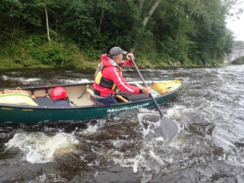 After a further 5km we were expecting another weir (Rutherford Cauld). There was a small rapid ahead and it did not look like a weir, so we drifted up to the edge and then one after another paddled over. The waves were considerably bigger than expected but we had little time to prepare and get settled in our canoes. Looking back, I saw Brian out of his boat, but it had remained upright – he was holding on to a cow’s tail at the back and was waving and smiling so all was good. Ian managed to get to him as he drifted downstream still in the wave train and Brian managed to climb over Ian`s canoe and into his. We all eddied out behind a fisherman`s wing dam or wing dyke (artificial wall into the river) to bail out.