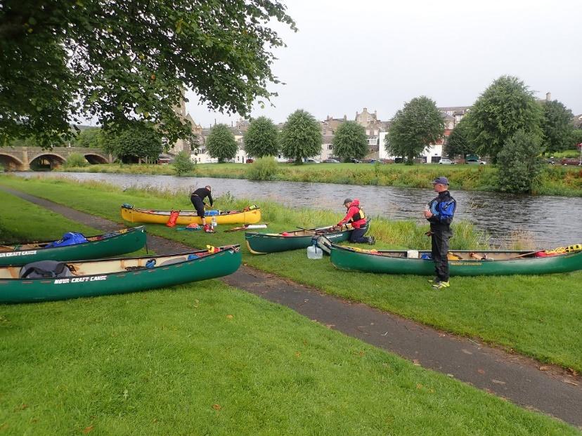 The August Bank holiday was fast approaching, and several ideas were put forward, white water, sea kayaking and Open Canoeing. Strong winds on the Llyn Peninsula, lack of white water resulted in a three-day trip down the river Tweed on the Scottish border. Club open canoes were available, but we ended up with 6 paddlers all paddling their own craft: Brian, Keith, Ian, Graham, Andrew and Gareth. We all headed up on Friday evening / night and camped, bivvied or stayed in a hotel. We met up early on the Saturday in Peebles