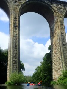 The journey began with a short carry downhill from the Ty Mawr Country Park Visitor’s Centre. As the river passed under the second bridge, it began to improve in character. The paddlers entered tree-lined secluded areas, with the occasional pheasant to be seen. The journey was punctuated by Grade II rapids and decisions on channels around the islands. The A483 road bridge provided a stark contrast to the bridges of earlier eras seen higher up the river.