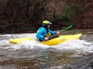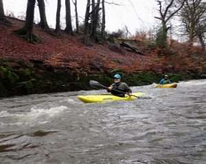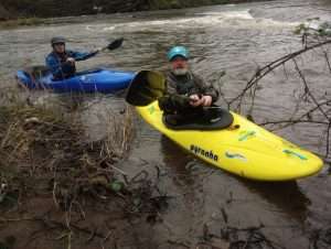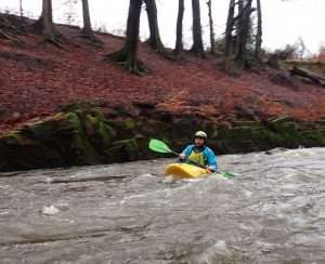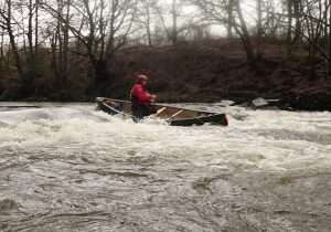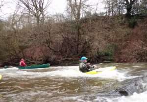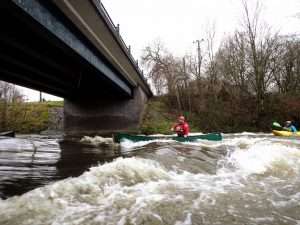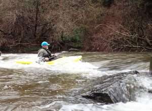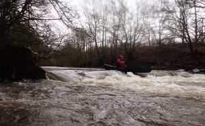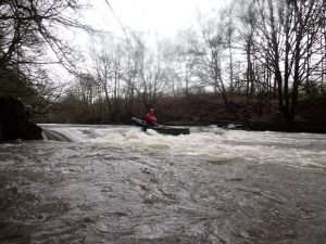 Would be ok from 0.40m easy to 0.70m at a push maybe 0.8m advanced paddlers – trees down by weir and also the weir was too sticky anywhere except steps at 0.54m
