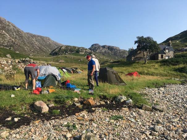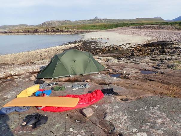 The payoff for an early start was that we had arrived at Seana Chamas in the early afternoon. So once our two camps were up (grassy one for sand refusers and sandy one for sheep tick refusers), it was actually like a proper holiday, with plenty of time to relax and chill. A superb and memorable day ended with the customary gourmet cooking, good conversation, a swig (or several) of Bunnahabhainn and the reddening sun sinking into the sea in front of us.