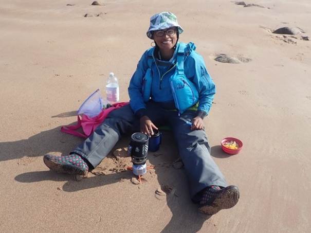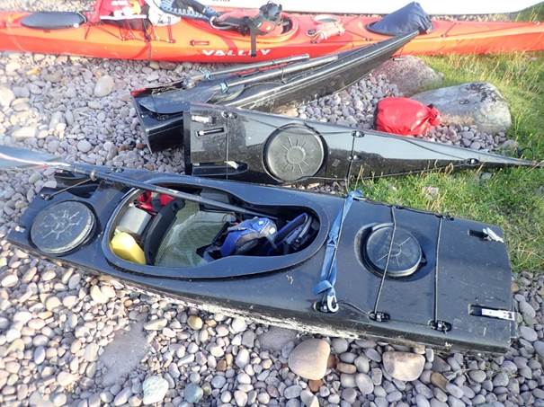 Waking to a midgy misty morning we quickly loaded (threw) gear into the cars to transfer boats and all the paraphernalia involved in a week’s sea paddling to the beach right by the campsite to get packed and sorted. It has been suggested I refused to move on the beach until I had coffee. Moi?