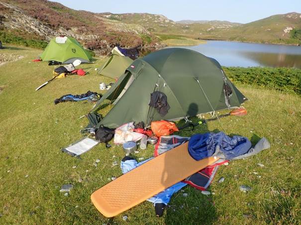Others found spots but soon started to find midges in the grass. Some of us had experience from previous trips in Canada where we camped on rock platforms, so chose this as our preferred option. Once the tents were set up and with some of the weight of our kit out of the boats, they were carried up to top of rocks, so they would be safe for the night. By now, most of the day trippers had left, so we began to cook the evening meal.