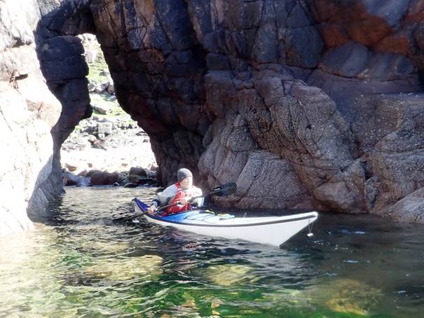 The day started somewhat overcast but calm with very little wind as we made the short crossing to the headland of Rubha Reidh, resisting the temptation of a detour down into Loch Ewe. There were some hugely impressive red rock arches to explore. As we worked our way along the coast to the Rua Reidh lighthouse, the coastal features were like a sea kayakers sweetshop with fantastic rock formations, caves and a very photogenic waterfall. I say photogenic, it was until several of us tried to paddle underneath it and recreate the old Timotei adverts. One particular cave was really memorable - a very narrow and dark 60ish yard long tunnel with a big dark void part way along - very spooky.